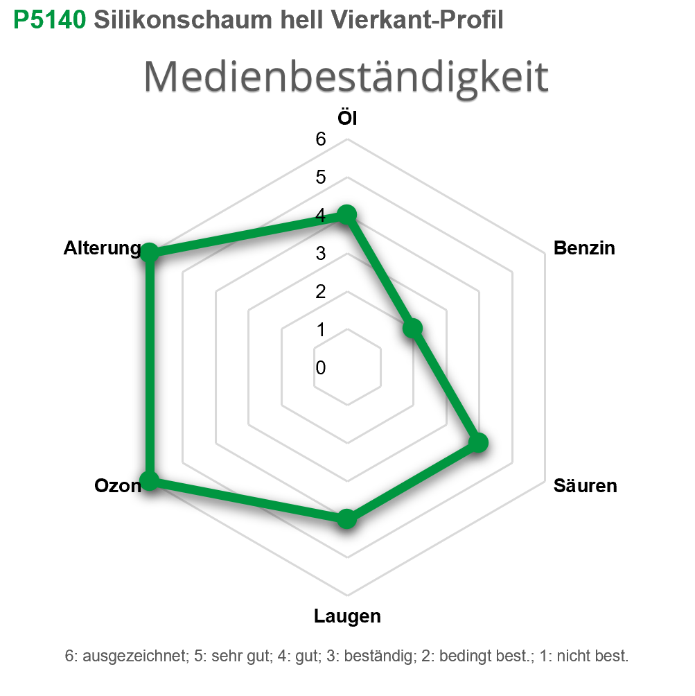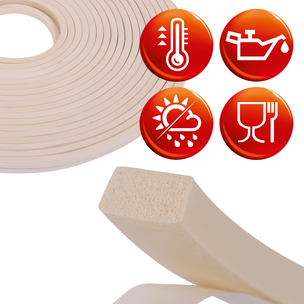 The silicone foam is made of methyl silicone rubber (VMQ) and is a rubber compound for versatile thermal sealing applications, and at low and high temperatures, the material properties of the rubber compound change only insignificantly. The silicone foam is produced (extruded) in a special process (expansion) into a sponge rubber foam and has a predominantly open-cell structure with a closed outer skin. The rubber is odorless, tasteless and electrically insulating, is characterized by a very good elasticity in the cold area and is approved for use in the food industry (FDA compliant). The resistance to oils, fats, oxygen, ozone, UV rays, weathering and aging is very good, as well as good against weak acids and alkalis.