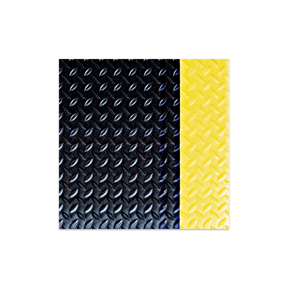 - der Belag besteht aus einem Hart-PVC Deckmaterial mit Rautenstruktur und einem Untermaterial aus geschäumtem PVC. Ober- und Untermaterial sind vulkanisiert und absolut fest miteinander verbunden.