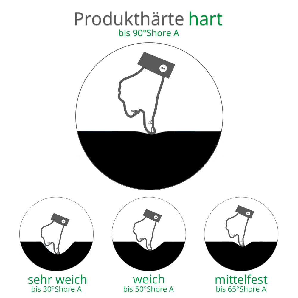 The hard rubber compound has a hardness of about 80°Shore A and has a high intrinsic stability and a low bending behavior. Compared to the standard hardness (like car tires) of approx. 65°Shore A, this rubber compound is a little harder and stays very stable in shape over a large area of pressure and does not noticeably spring. The natural vibration of the rubber is very low under load.