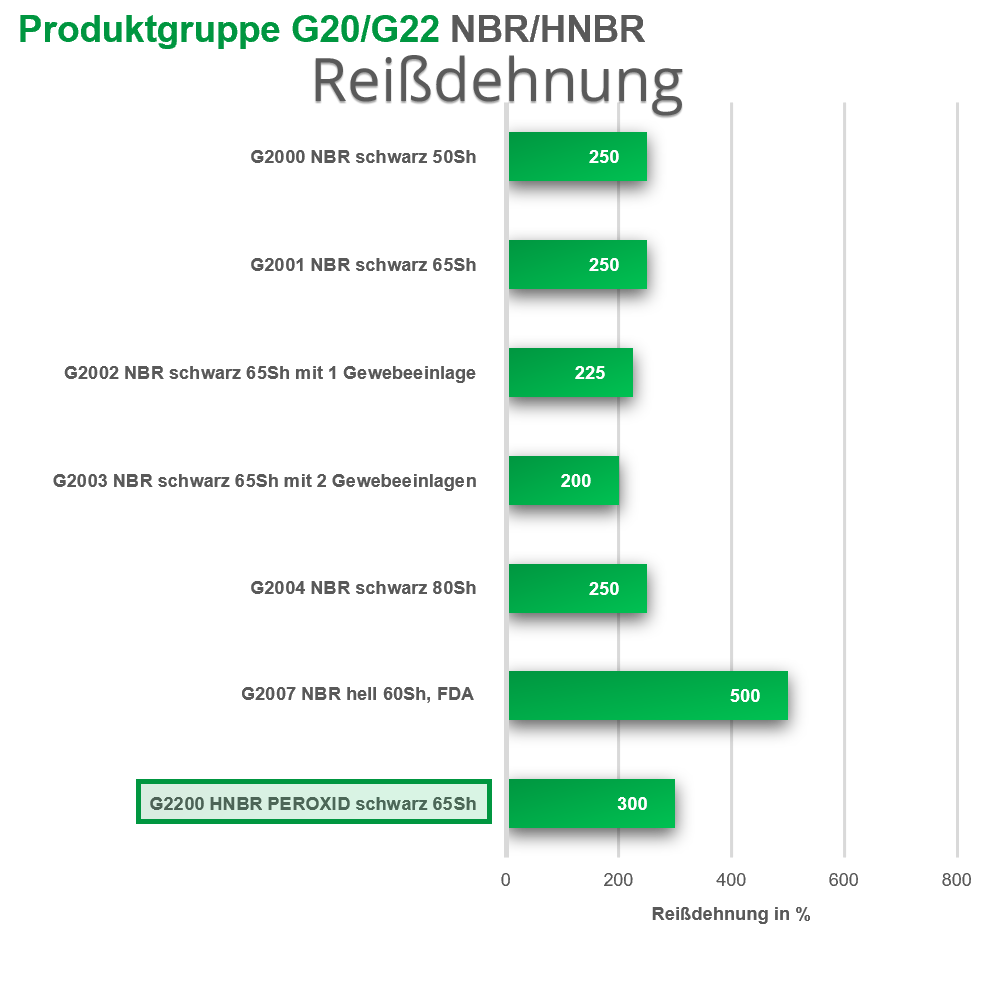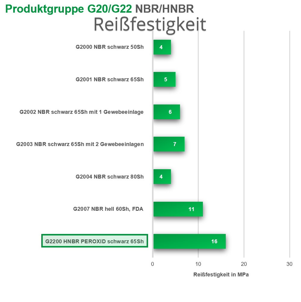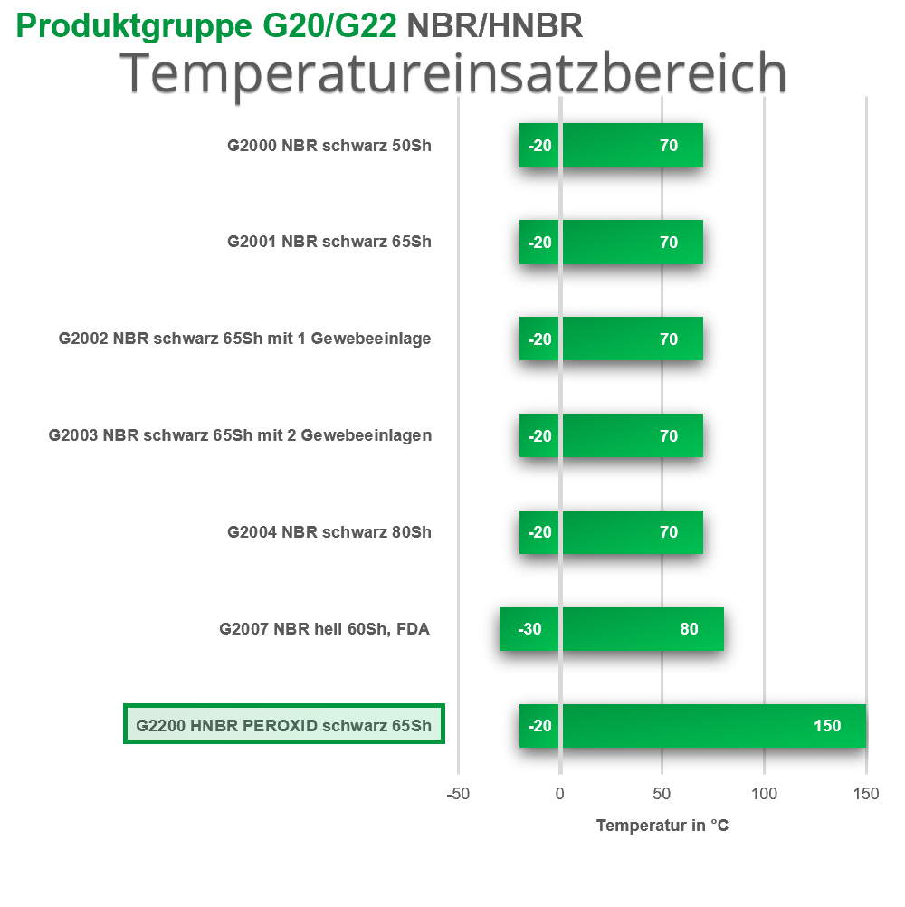 The HNBR rubber consists of peroxide cross-linked acrylonitrile and butadiene, is a copolymer and is a rubber compound for thermal and oil-resistant sealing applications. The rubber is characterized by excellent oil resistance, abrasion resistance, tensile strength and temperature resistance (up to + 150 ° C), even with permanently high temperature load. The resistance to oils, fats (vegetable and animal), fuels and heating oils is excellent.