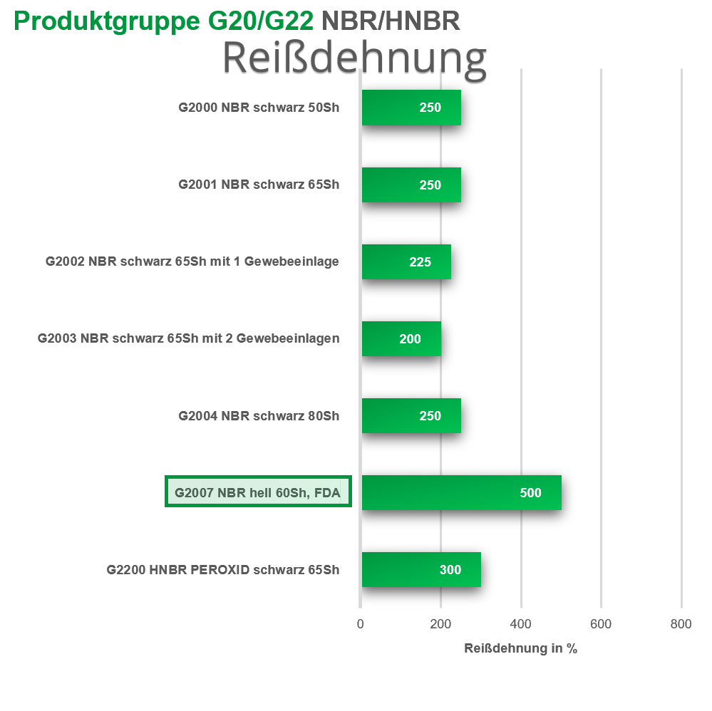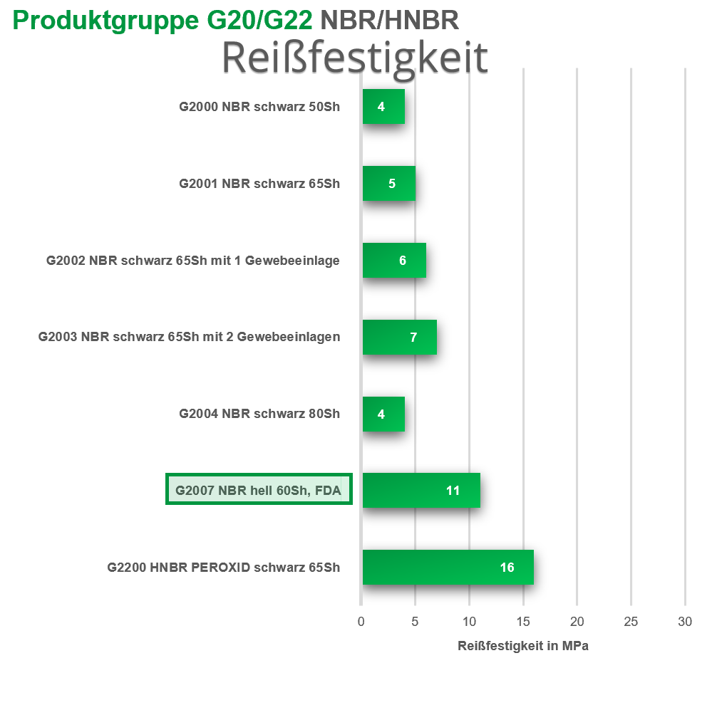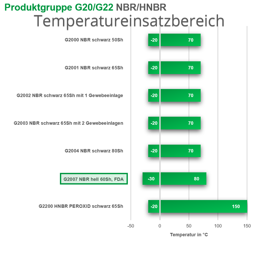 The NBR rubber (also called Perbunan) consists of acrylonitrile and butadiene, is a copolymer and is a rubber compound for special sealing applications in the food industry and in the industrial water sector. The rubber is characterized by excellent oil resistance, abrasion resistance, tensile strength, as well as a favorable aging behavior and a low compression set. The rubber compound is suitable for direct contact with food. BgVV XXI (BGA) category 2. The resistance to oils and fats (vegetable and animal), as well as fuels and heating oils is excellent.