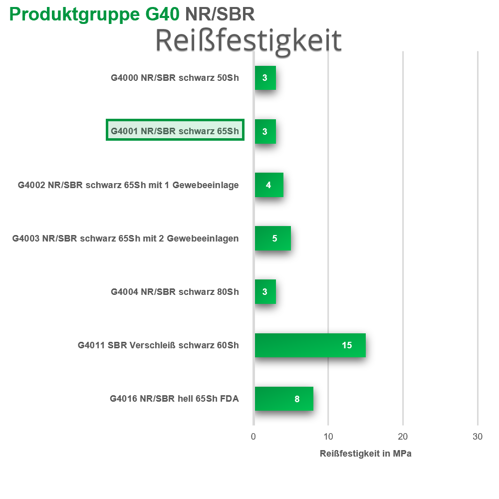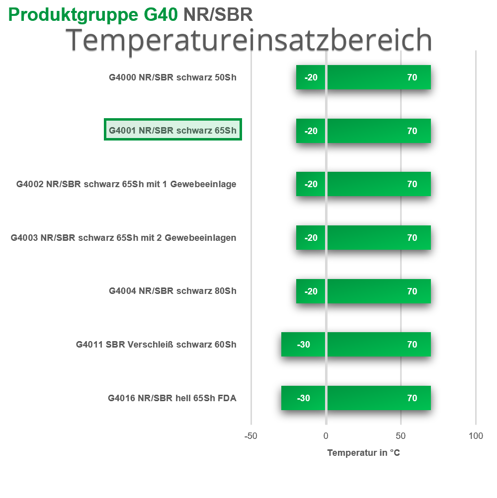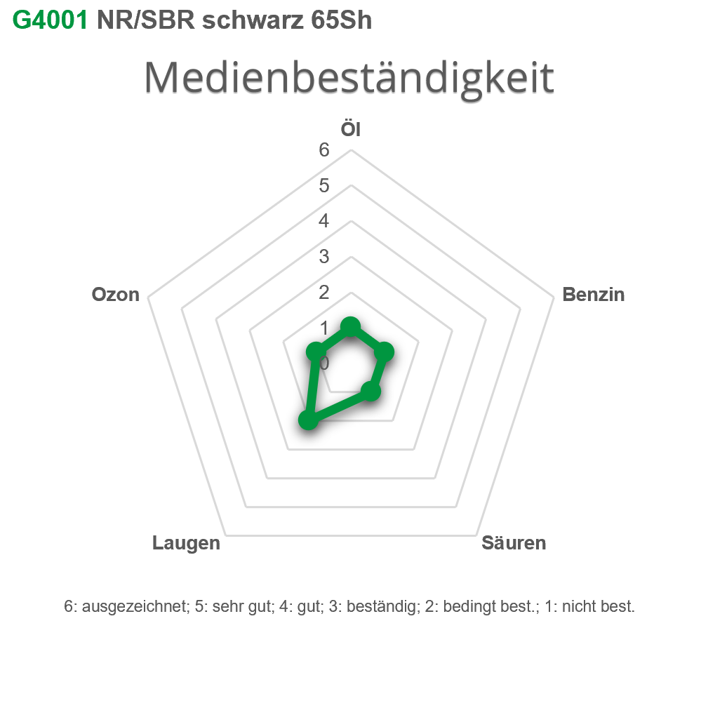 Das NR/SBR Gummi besteht aus Natur- und Styrol-Butadien-Kautschuk und ist die meist eingesetzte Gummimischung für viele einfache Anwendungsgebiete im Innenbereich und im UV geschützten Außenbereich. Das Gummi zeichnet sich durch gute Druckfestigkeit und Elastizität aus, sowie eine gute Beständigkeit gegen Aceton und Alkohol. Die Widerstandfähigkeit gegen Laugen ist bedingt bis gut.