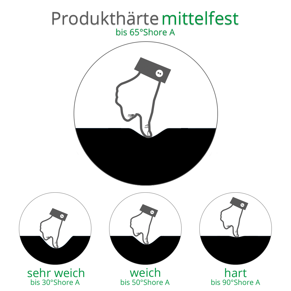 Die mittelfeste Gummimischung hat eine Härte von ca. 65°Shore A und ist die marktübliche Standardhärte für Gummi, zu vergleichen mit Autoreifen. Für viele Anwendungen die beste Wahl. Die Gummimischung bleibt bei großflächiger Druckbelastung formstabil und federt geringfügig ein.