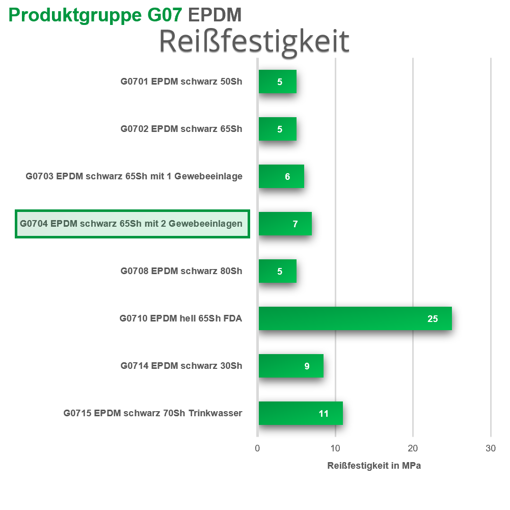 Das EPDM Gummi besteht aus Ethylen-Propylen-Dien-Kautschuk, ist ein terpolymeres Elastomer und ist die meist eingesetzte Gummimischung für viele Anwendungsgebiete im Außenbereich. Das Gummi zeichnet sich durch eine sehr gute Witterungsbeständigkeit, Ozonbeständigkeit und Temperaturbeständigkeit (bis +100°C)aus und ist extrem langlebig, aufgrund der sehr guten Alterungsbeständigkeit. Die Widerstandfähigkeit gegen verdünnte Chemikalien, Säuren und Laugen ist gut.